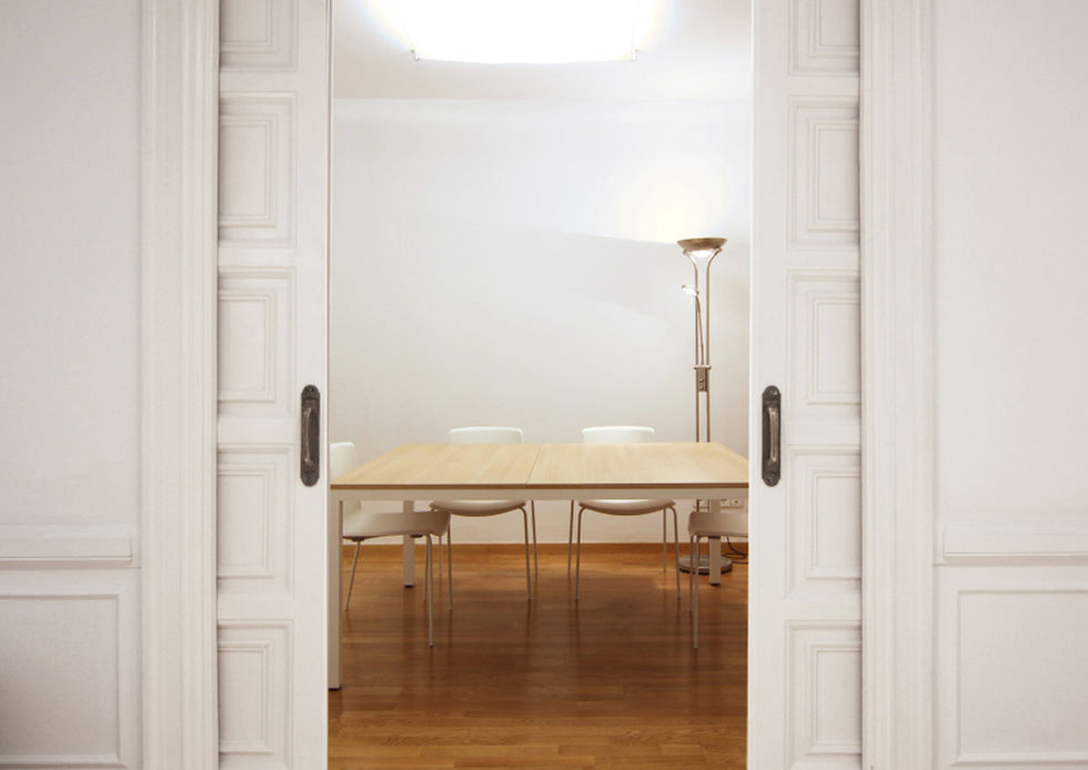 Es importante crear una conexión flexible entre el despacho de dirección y la sala de reuniones, es por eso que se adopta como solución el uso de puertas correderas, así como se decide derribar un tabique para hacer más amplio el espacio.